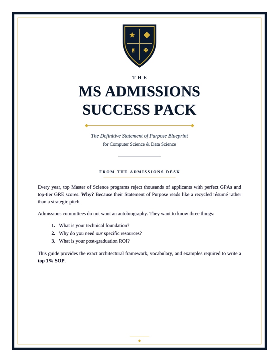 Top US Master’s programs in Computer Science and Data Science reject thousands of brilliant international applicants every season. The reason is almost always the same — their SOP reads like a recycled résumé instead of a strategic pitch. The MS Admissions Success Pack is the 14-page blueprint that fixes that.